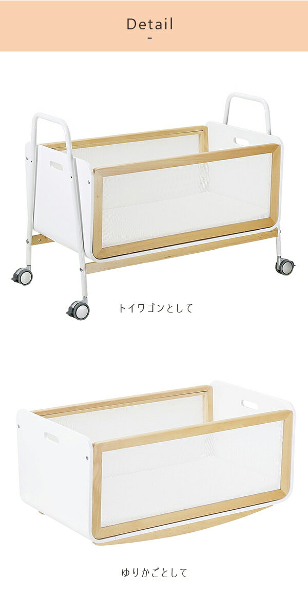 サイズ 約W890×D498×H858mm トイワゴンとして:約W890×D498×H670mm ゆりかごとして:約W824×D498×H400mm マットレスサイズ:約W790×D410×H45mm 本体重量 約13kg 材質 木部:化粧合板、天然木 パイプフレーム:スチール 棚布:綿100% メッシュ:ナイロン マットレス:カバー/綿100%、中綿/ウレタンフォーム 塗装 本体:ラッカー塗装 パイプフレーム:粉末塗装(エポキシ) 色 ホワイト・グレー 特徴 <組立式> 【生産国】中国 【耐荷重】棚布部 5kg 対象年齢:簡易ベッドとして/新生児〜7ヵ月頃(体重9kg以下) ※就寝用としては寝返りができるようになるまで(4〜5ヵ月頃まで) トイワゴンとして/耐荷重20kg以下 4輪キャスター(すべてストッパー付) マットレスカバー、棚布は洗濯可。