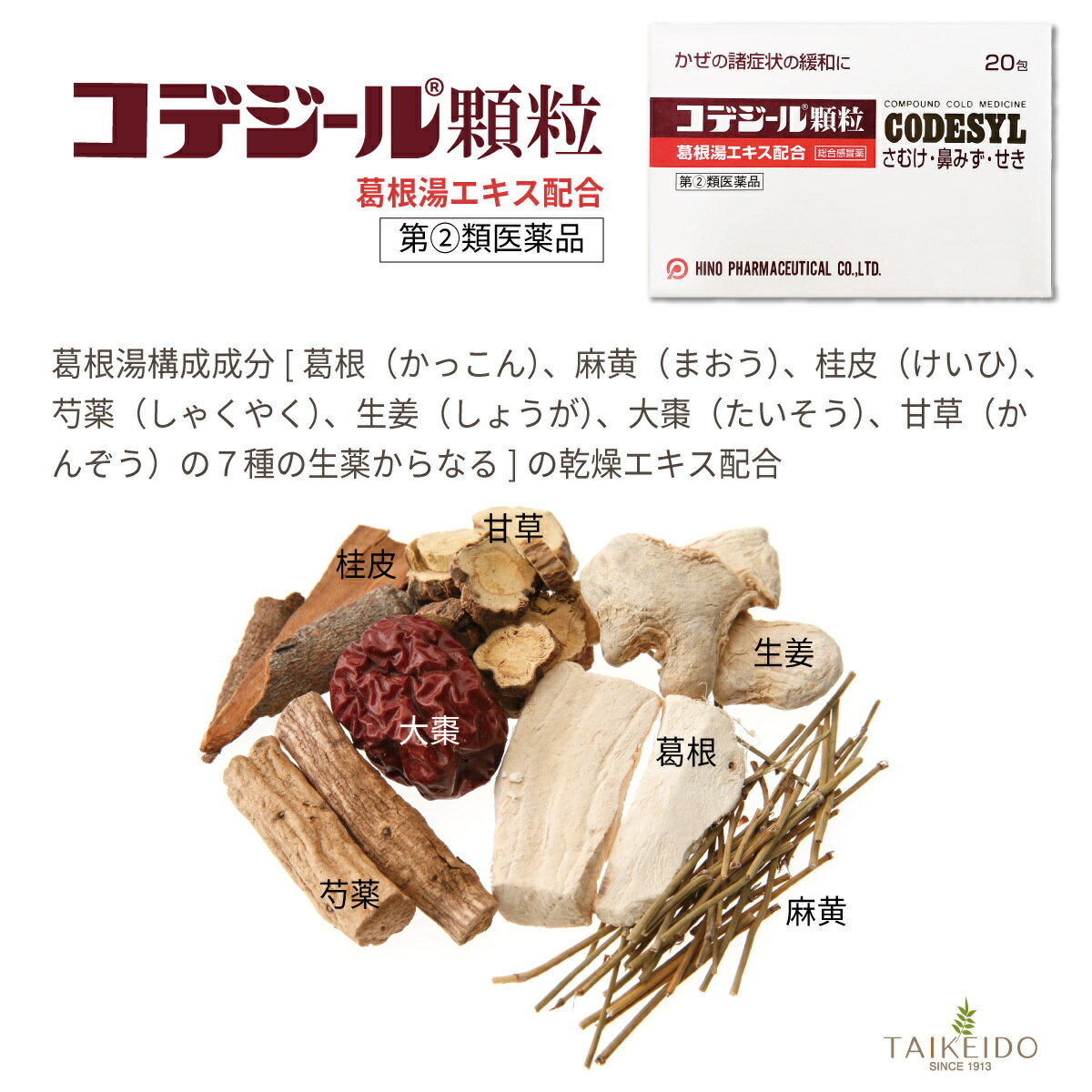 お問い合わせ 製造販売元日野薬品工業株式会社滋賀県蒲生郡日野町大字上野田119番地 お問い合わせ:TEL. 0748-52-1232区分 指定第2類医薬品 医薬品販売に関する記載事項(必須記載事項)はこちら【指定第2類医薬品】コデジール顆粒 20包 さむけ 鼻水 せき かぜの諸症状(鼻水、鼻づまり、くしゃみ、のどの痛み、せき、悪寒、発熱、頭痛、関節の痛み、筋肉の痛み)の緩和 特徴葛根湯配合のかぜ薬漢方薬に洋薬のよさをプラスしたかぜ薬です。