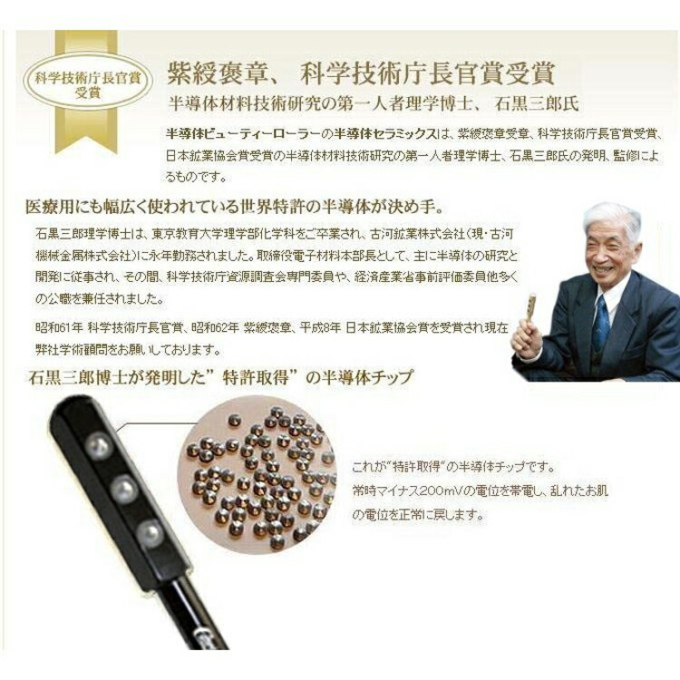 半導体ビューティーローラーナノイオンクラスター ●商品ポイント 業界初のマイナスイオン発生機能を搭載し、医療用にも幅広く使われている世界特許の半導体チップを使用した贅沢な美顔ローラーです。