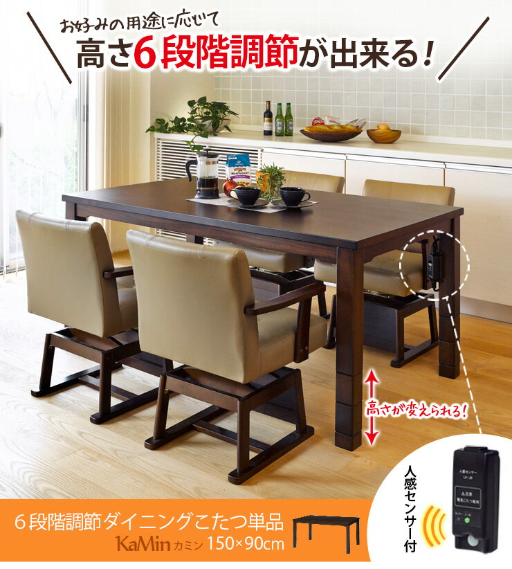 ダイニングこたつテーブル【KaMin】 長方形 幅150cm(こたつ本体150 ハイタイプこたつ ダイニングコタツ 高脚こたつ ダイニングテーブルこたつ 食卓用こたつ 木製こたつ 高さ調節 機能こたつ 人感センサー)