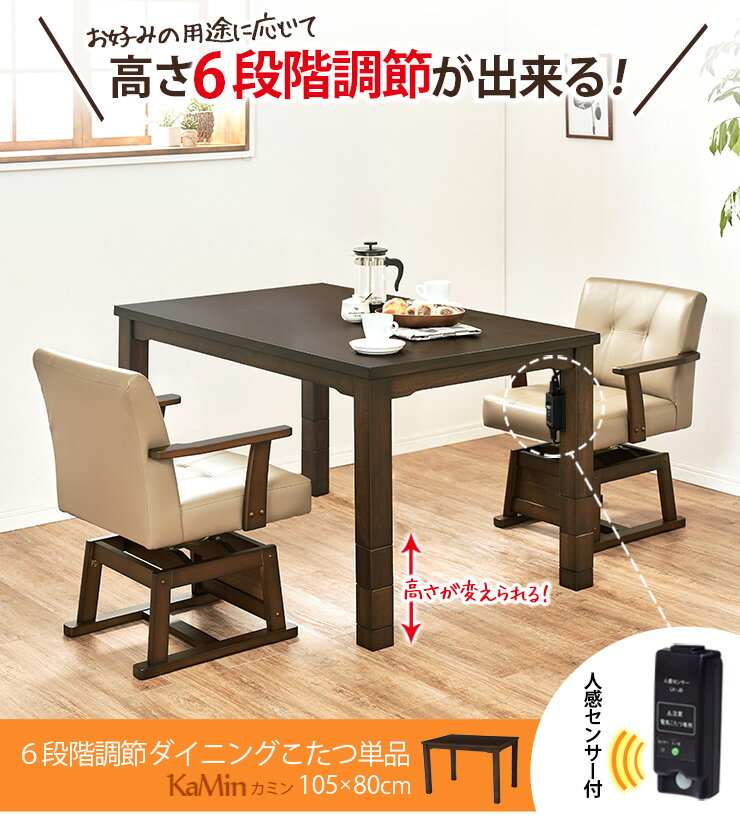 【最大2000円OFFクーポン配布中 !11/6〜】ダイニングこたつテーブル【KaMin】 長方形 幅105cm(こたつ本体105 ハイタイプこたつ ダイニングコタツ 高脚こたつ ダイニングテーブルこたつ 食卓用こたつ 木製こたつ 高さ調節 機能こたつ 人感センサー)