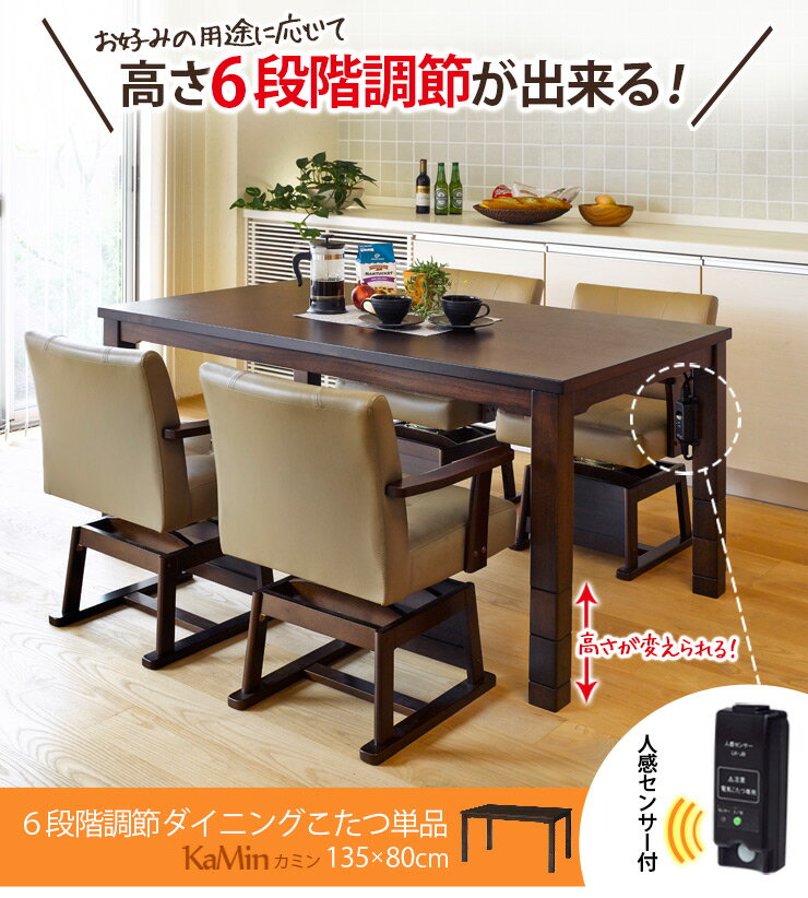 ダイニングこたつテーブル【KaMin】 長方形 幅135cm(こたつ本体135 ハイタイプこたつ ダイニングコタツ 高脚こたつ ダイニングテーブルこたつ 食卓用こたつ 木製こたつ 高さ調節 機能こたつ 人感センサー)