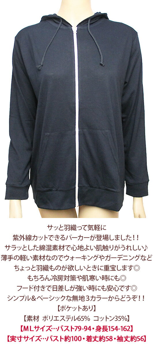 薄手の軽い素材なのでウォーキングやガーデニングなどちょっと羽織ものが欲しいときに重宝します◎ もちろん冷房対策や肌寒い時にも◎ フード付きで日差しが強い時にも安心です◎ シンプル&ベーシックな無地3カラーからどうぞ!!