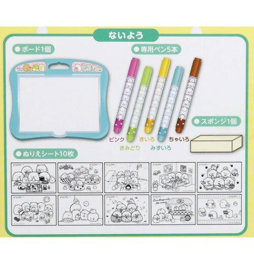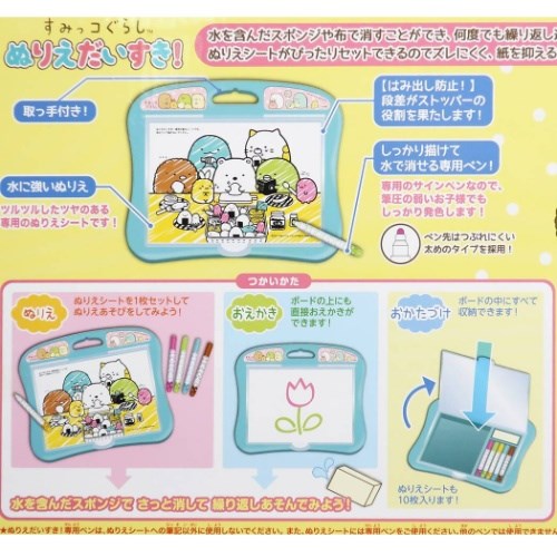 水でサッと消して繰り返し遊べる専用ボード付きぬりえセット塗り絵 ぬり絵 おもちゃ 子供 キッズ大人気[すみっこぐらし]グッズにまたまた可愛いnewアイテム登場 こちらは水を含んだスポンジや布で消すことができる何DPでも繰り返し遊べる塗り絵セット[ぬりえだいすき!]塗り絵シートがぴったりセットできるボード付きで紙がずれにくく、紙を抑える力が弱いお子様でも集中して遊ぶことができます。