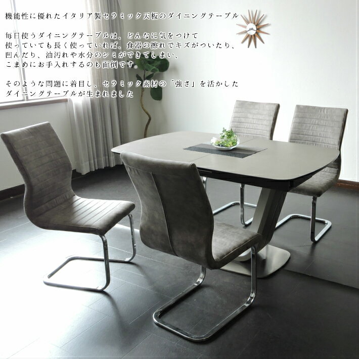 サイズ (テーブル) ・幅 140cm - 180cm ・奥行き 85cm ・高さ 73cm (チェアー) ・幅 44cm ・奥行き 58cm ・高さ 92.5cm(座面まで42cm) 材質 ・イタリアンセラミックトップ/強化ガラス ・ステンレス ・レザーファブリック(チェア) ・スチール 備考 [機能性に優れたセラミック天板のダイニングテーブル] 毎日の食事で使うダイニングテーブルは、どんなに気をつけて使っていても長く使っていれば、 食器の擦れキズがついたり、凹んだり、水や油汚れのシミができてしまいます。