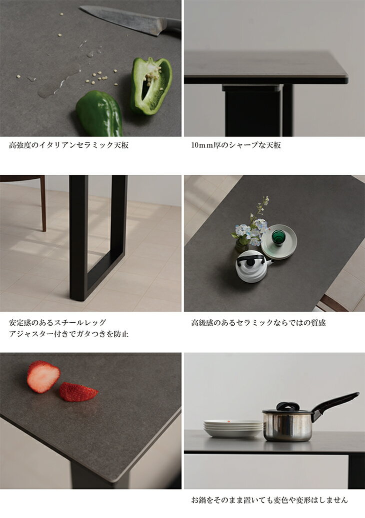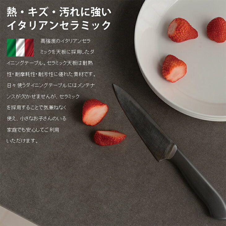 熱・キズ・汚れに強いイタリアンセラミック 高強度のイタリアンセラミックを天板に採用したダイニングテーブル。